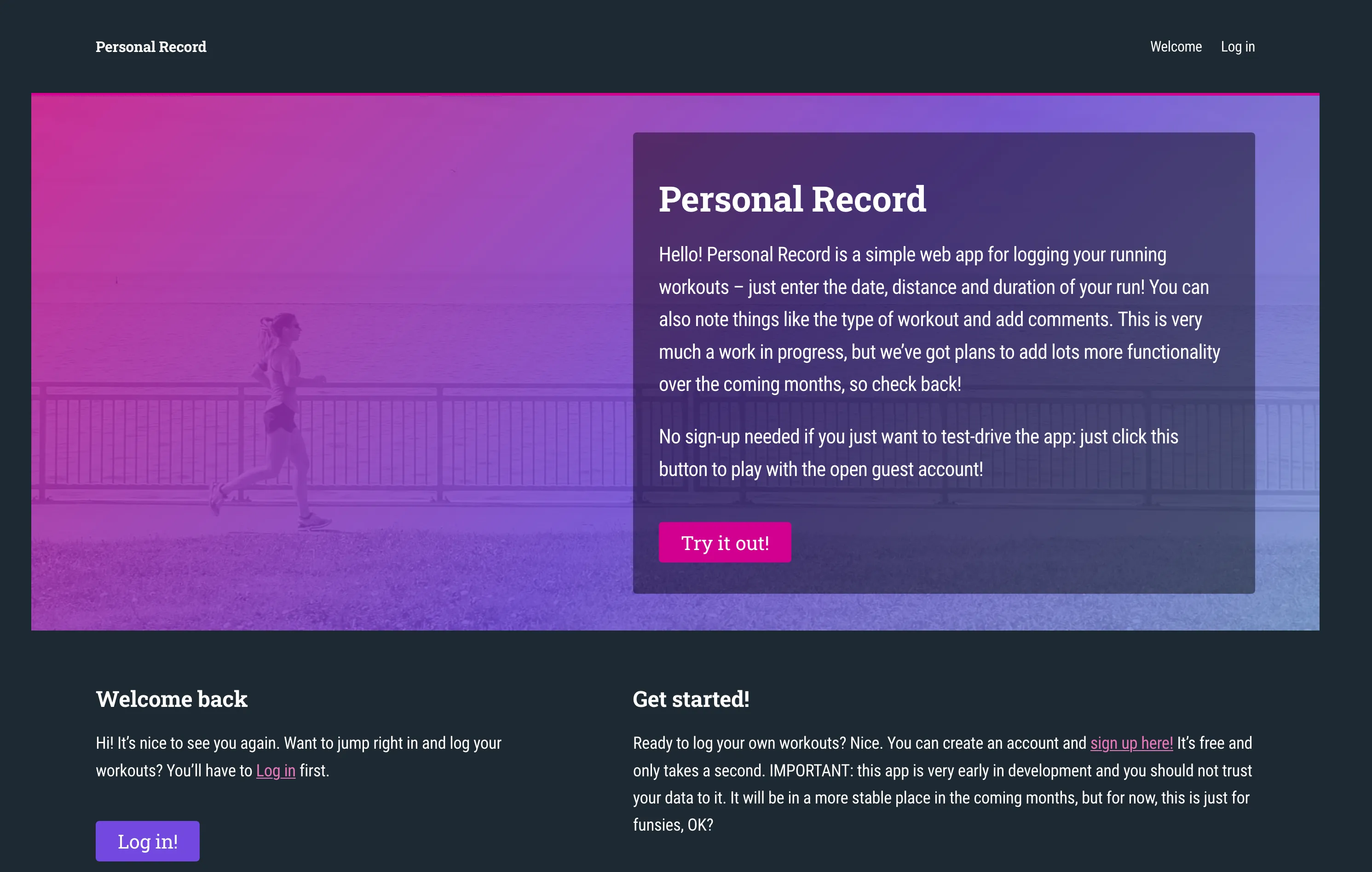 Personal Record began as a class project: as part of the Full-Stack Masterclass at Juno College, students are asked to design and implement a RESTful API using Node, Express, and MongoDB. I decided to build a simple log to track running workouts - why not combine two things I love, code and running?